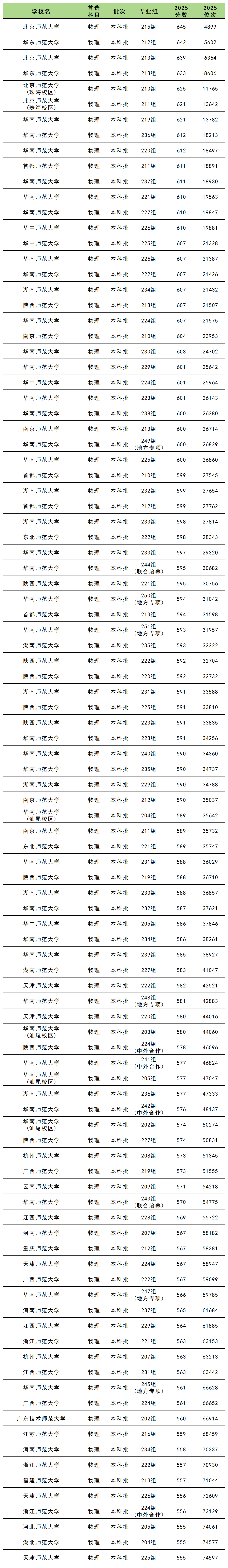 如下为各位展示的是2025年广东物理组师范院校的Top100录取分及位次情况: