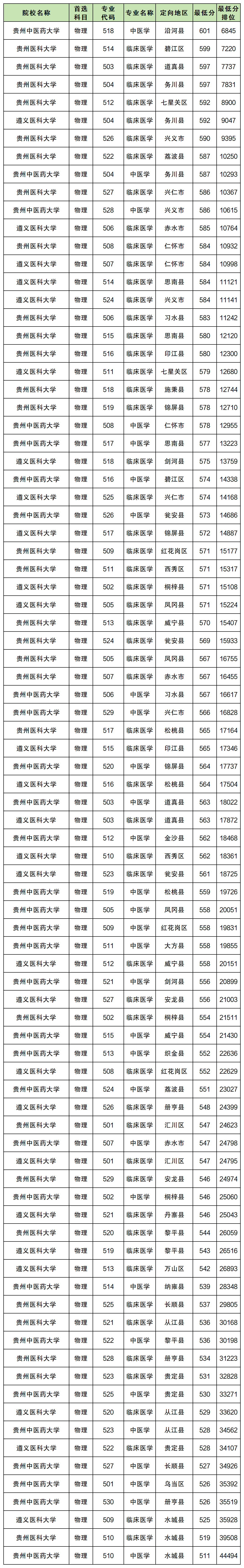 2026年免费医学定向生报名条件、报名时间、报考流程下文有详细说明。以贵州省招录数据为例,2025年免费医学定向生分数线物理类在511分到601分之间;历史类在549分到605分之间,各大学最低分不相同,具体如下。