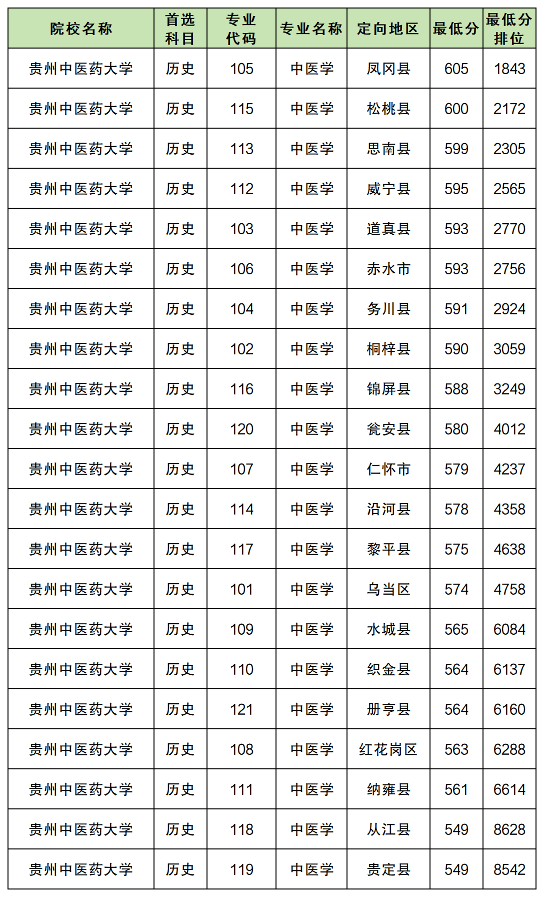历史组分数较低的是贵州中医药大学(定向地区:贵定县、从江县),最低分549分。