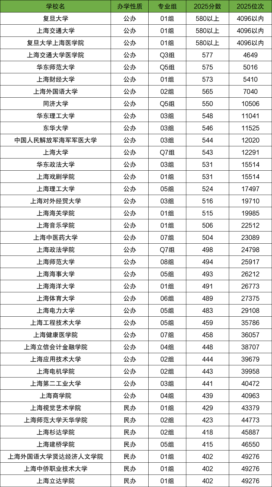 2025年上海本科各大学在上海最低录取分数线位于402分-580分以上,位次位于49276名-4096名以内。
