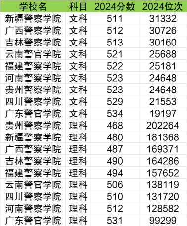 2024年文科录取分数线最低的二本警校一共有6所,包括吉林警察学院、湖南警察学院、贵州警察学院、湖北警官学院等。