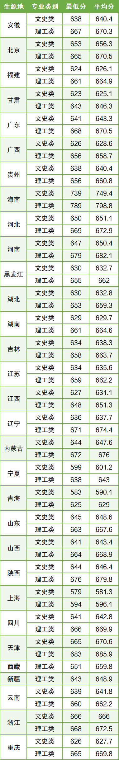 文理科专业最低分招生省份均为上海市,2025年最低录取分数线分别为579分和594分,其中文科超特控线74分、理科超特控线89分;文理科专业最高分招生省份均为海南省,2025年最低录取分数线分别为739分和789分,其中文科超特控线171分、理科超特控线221分。