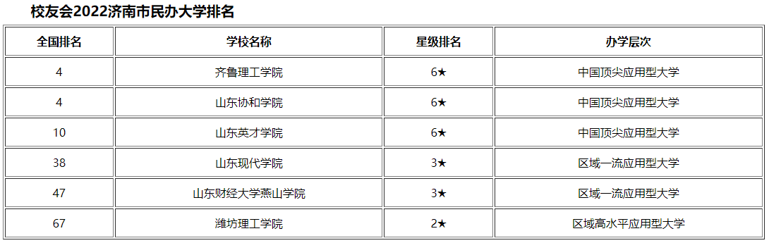 根据校友会2022年济南市民办大学排名可知,济南市最好的六所民办大学及全国排名如下。