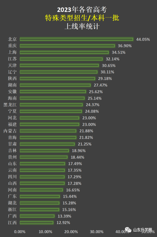 关于2023年各省特招线/一本线上线率,如下图: