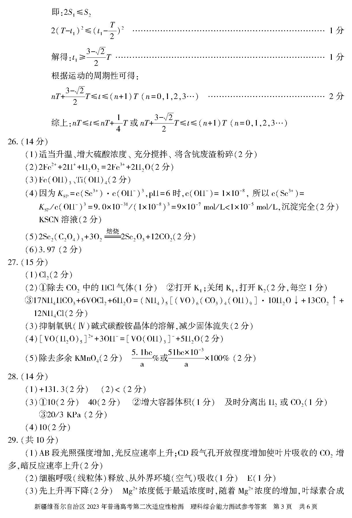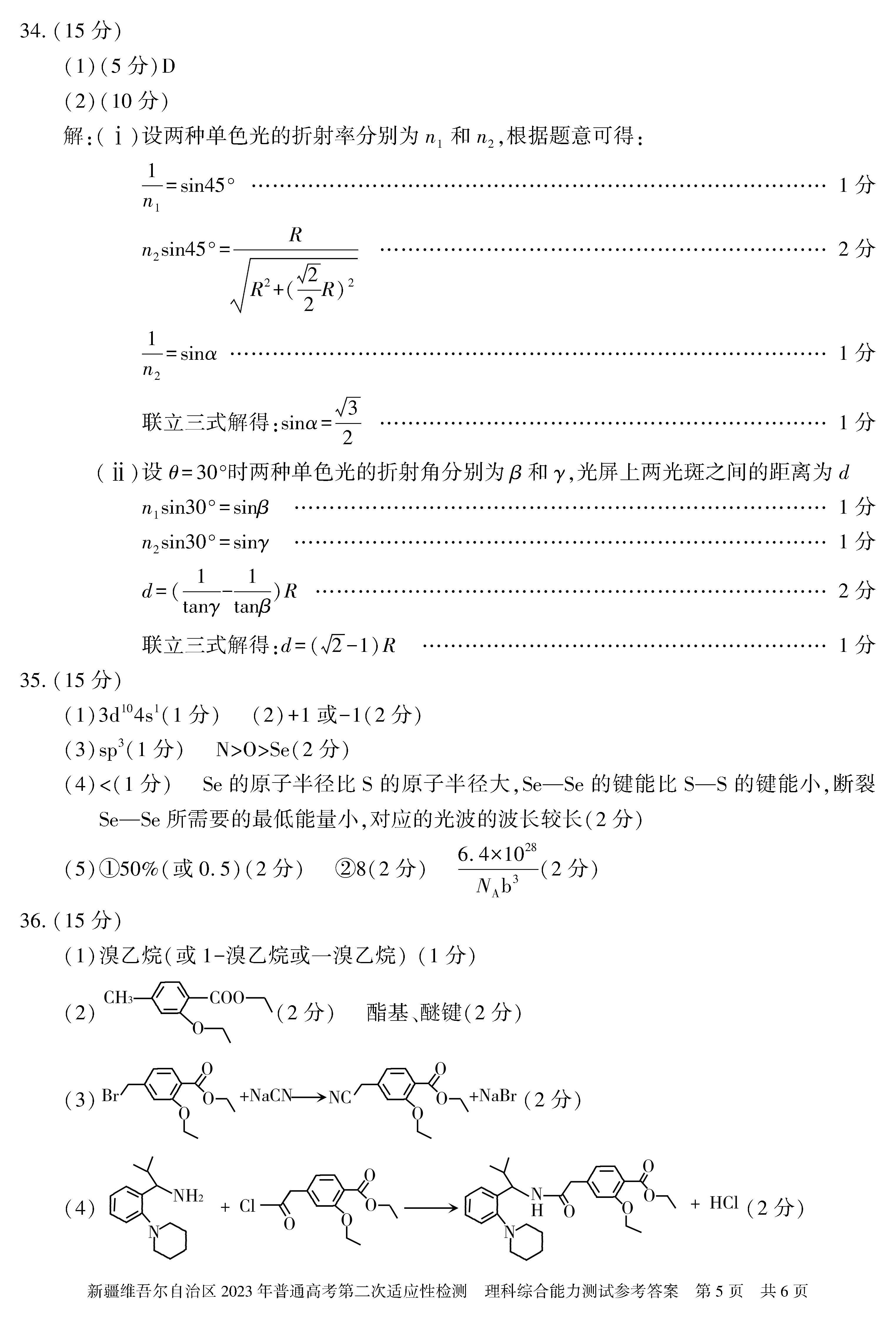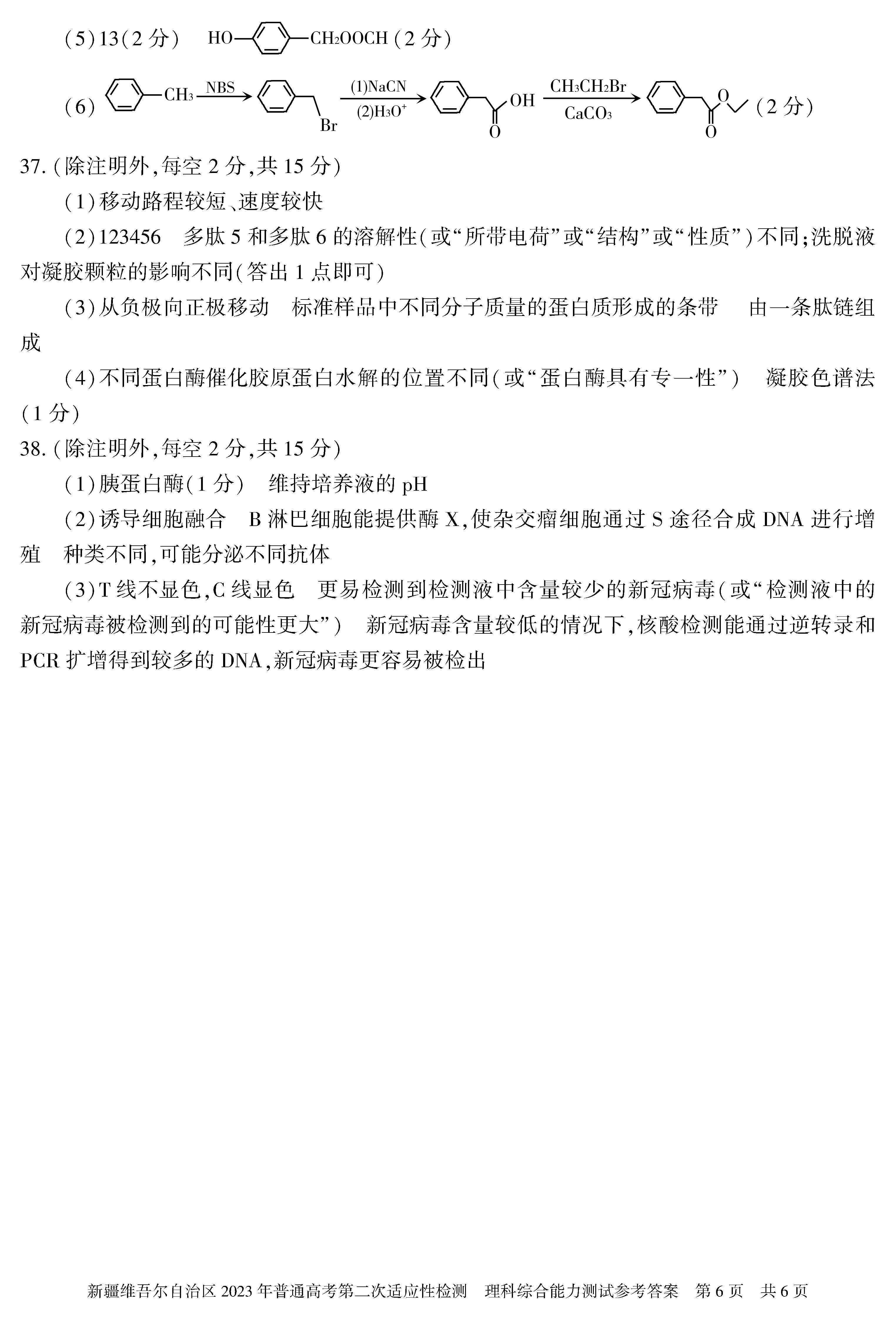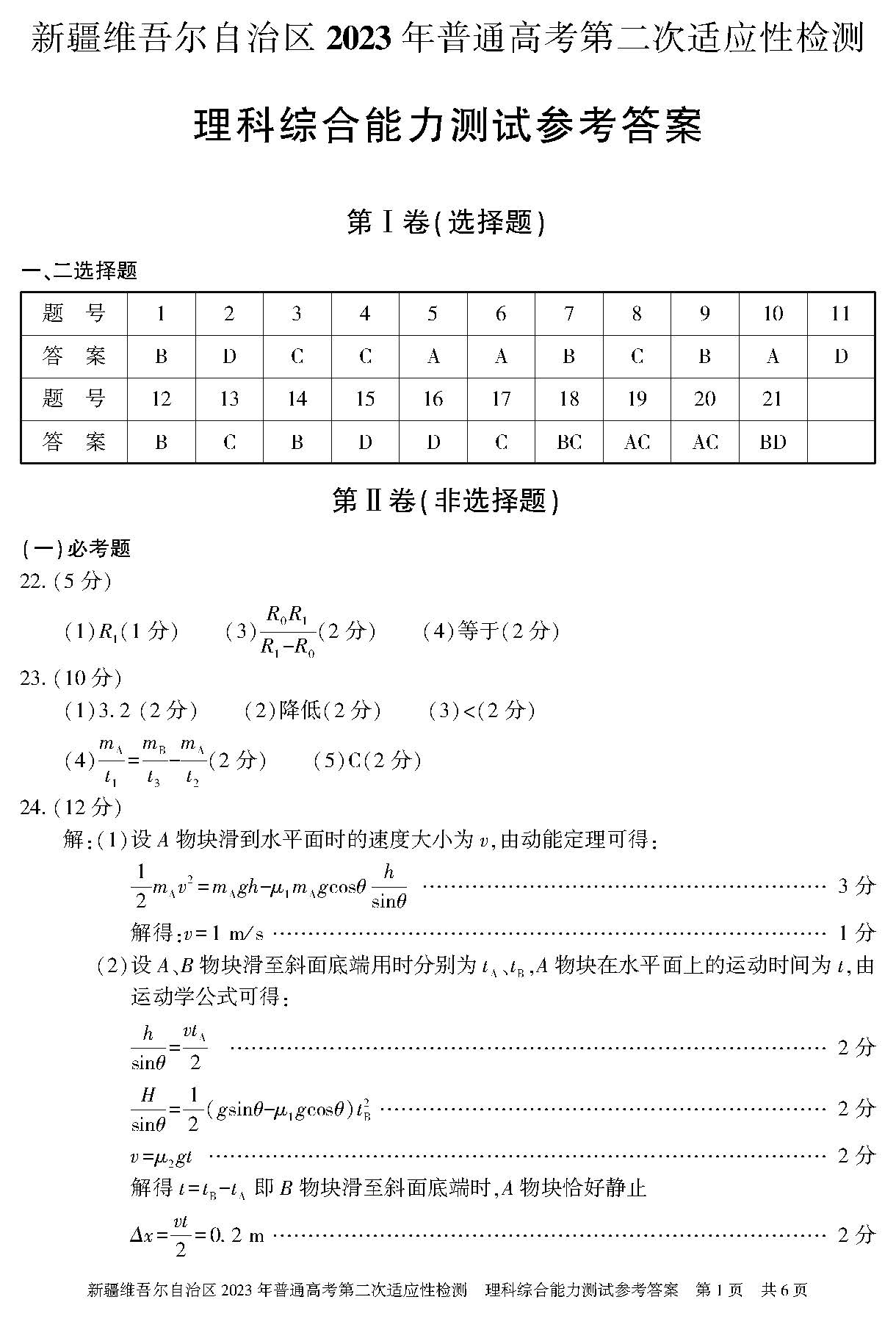 二、2023新疆高考第二次适应性检测理科综合参考答案