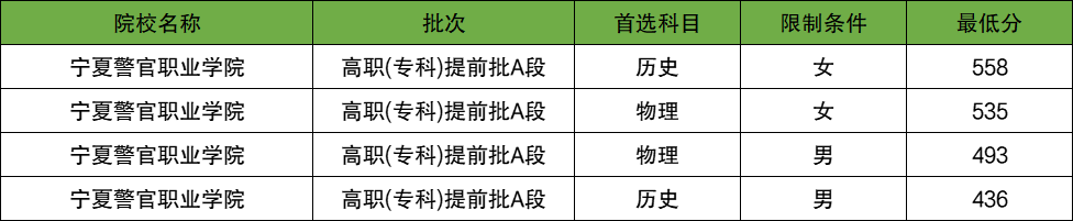 宁夏警官职业学院是我国公安类警校,2025年在宁夏提前批招生录取分数线如下:公安类专业男生最低分436分、女生最低分535分。