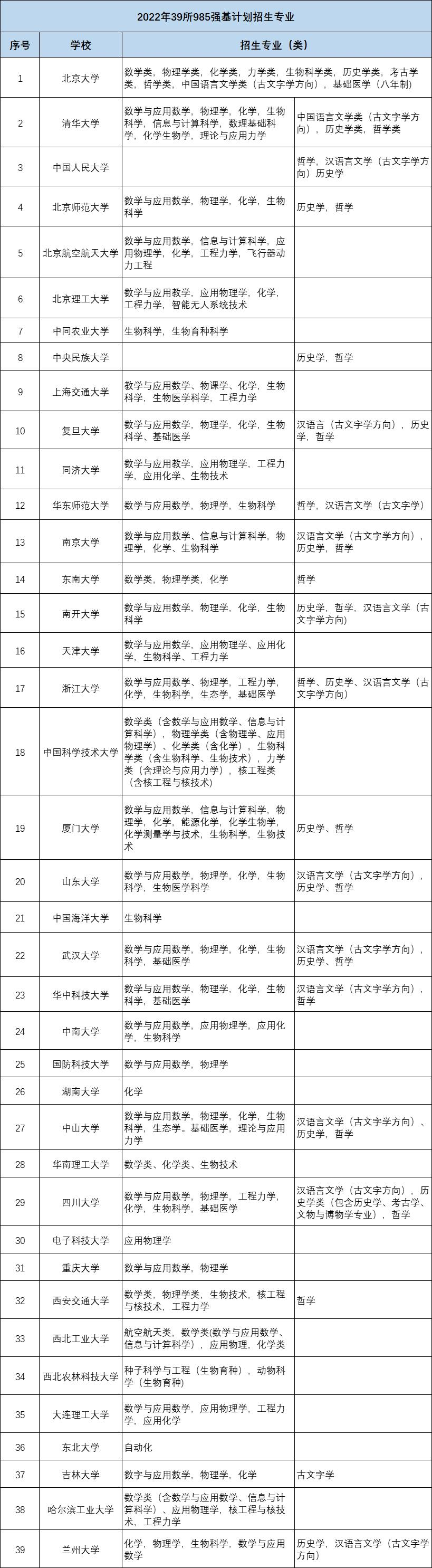 39所985强基计划招生专业就是这些啦!