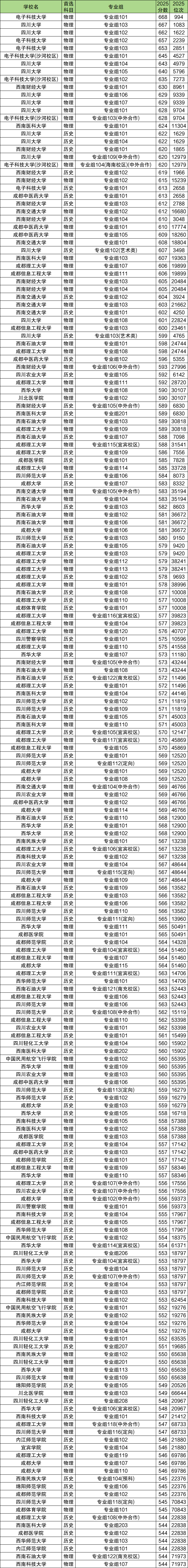 2025年四川各大学录取分数线位次前200强院校专业组名单(历史类96个、物理类104个):