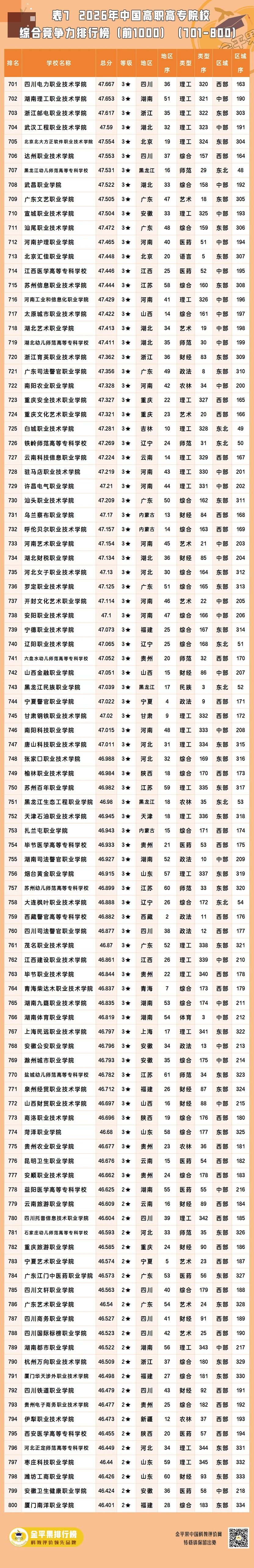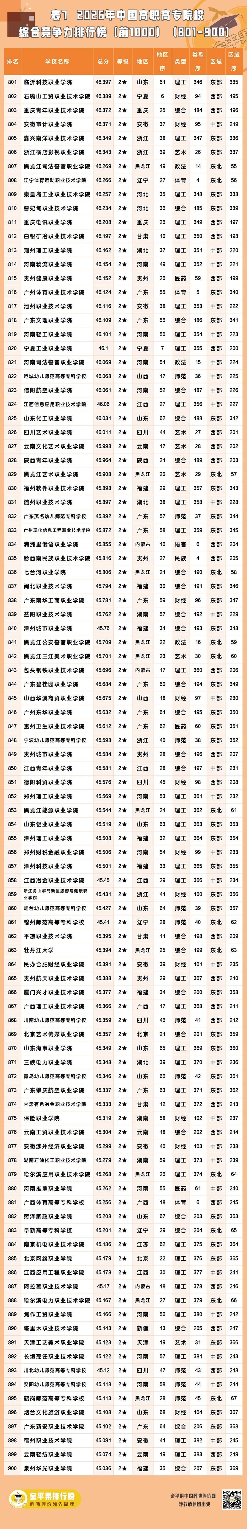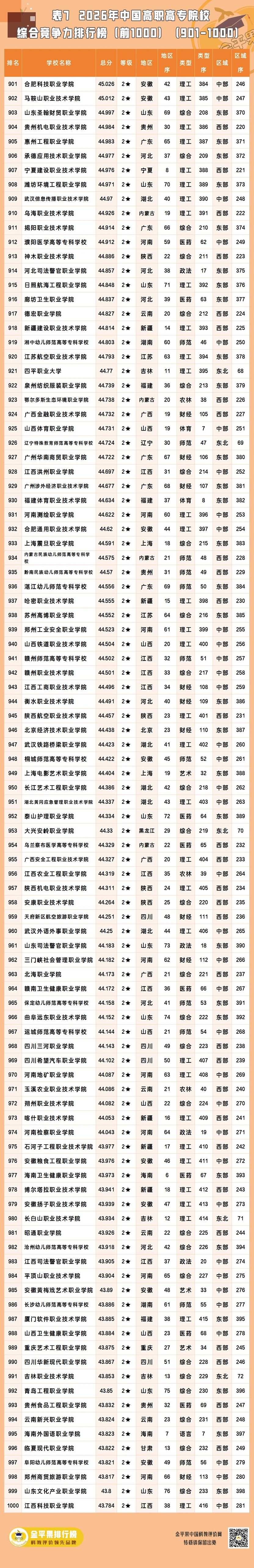 以下为金平果2026年中国高职高专院校综合竞争力排行榜前1000强名单(1554所高校中的前列院校):