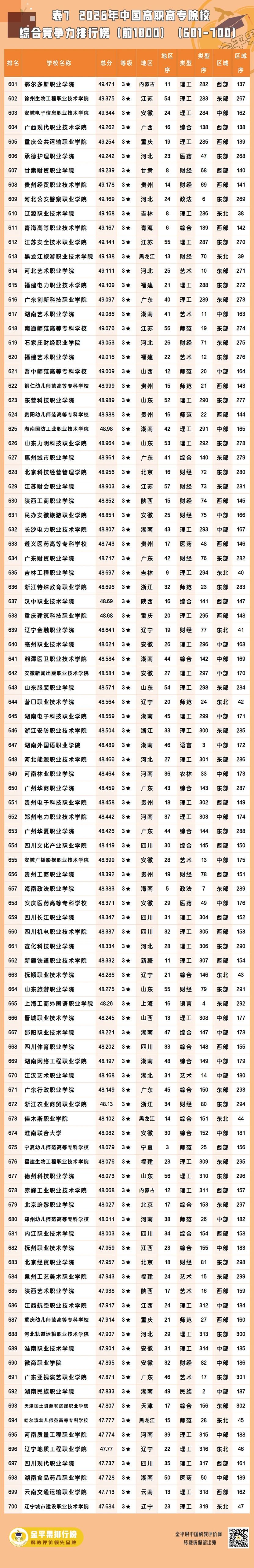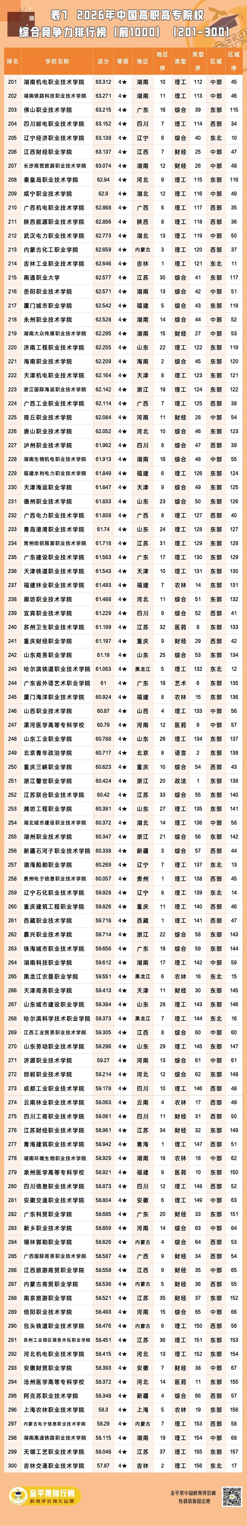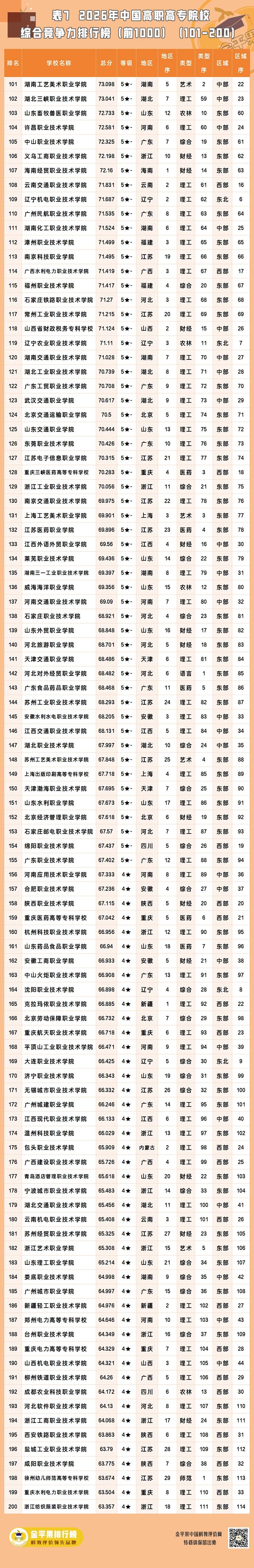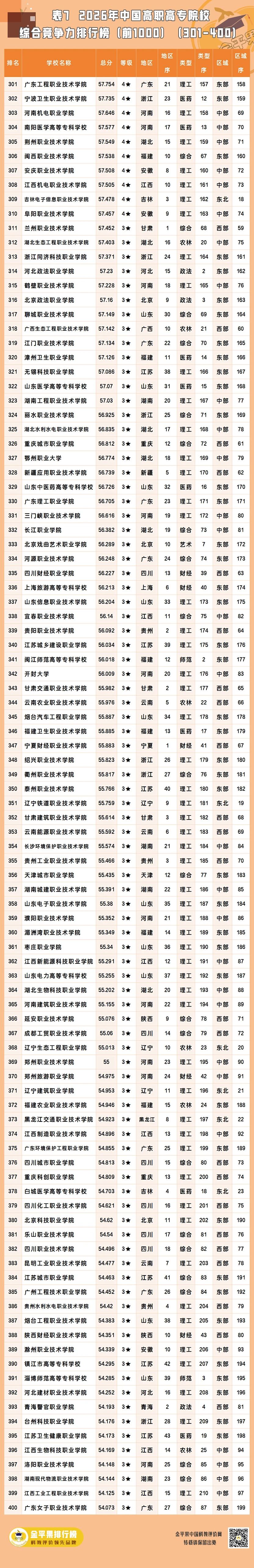 以下为金平果2026年中国高职高专院校综合竞争力排行榜前1000强名单(1554所高校中的前列院校):