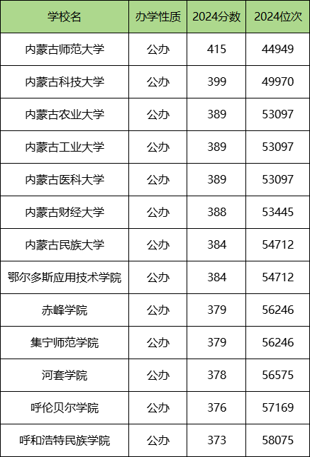 2024年内蒙古公办二本大学在理科的录取分数线位于373分~415分之间(不含普通考生无法报考的特殊专业)。