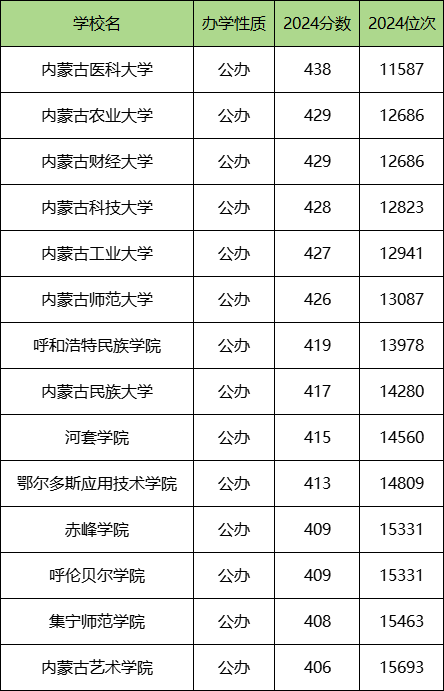 其中,分数线排名第一的公办二本大学是内蒙古医科大学(438分),除此之外,收分较高的院校还有:内蒙古农业大学(429分)、内蒙古财经大学(429分)、内蒙古科技大学(428分)、内蒙古工业大学(427分)。