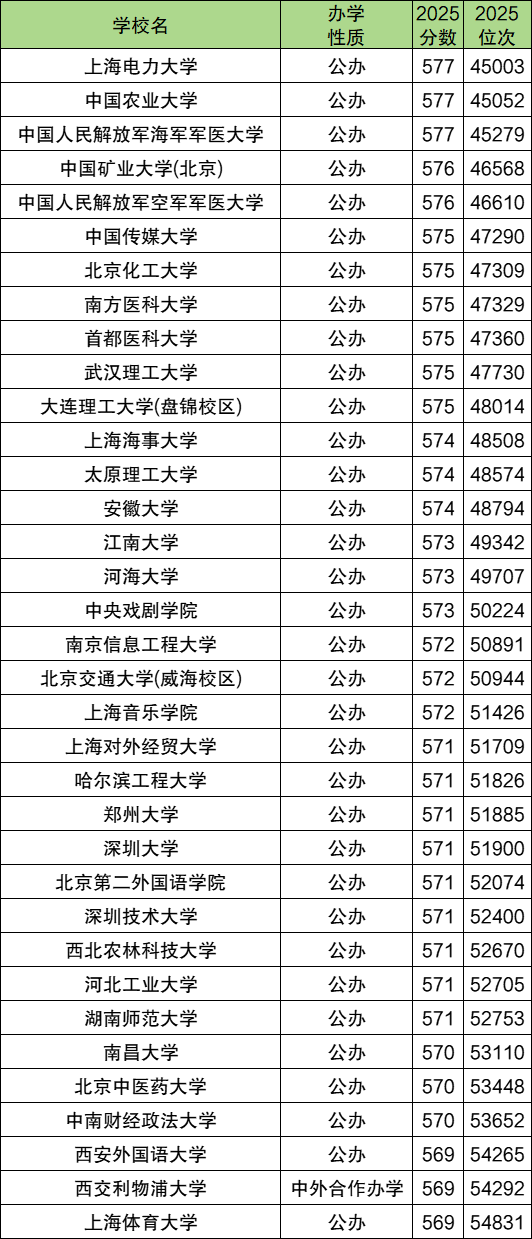 2025年录取位次在5万名左右的大学有:北京化工大学、首都医科大学、太原理工大学、哈尔滨工程大学等,最接近5万名的是中央戏剧学院(50224名),5万名左右对应的学校录取分数线是569分到577分;5万名左右有机会上211。