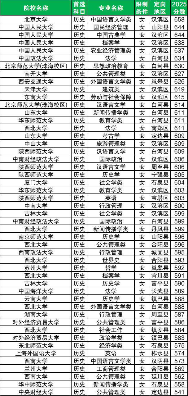 历史类分数线最高、最难考的是北京大学,女生2025年被该校中国语言文学类(定向汉滨区)录取最低分为658分。其次是中国人民大学国民经济管理专业(定向山阳县),2025年最低分644分。