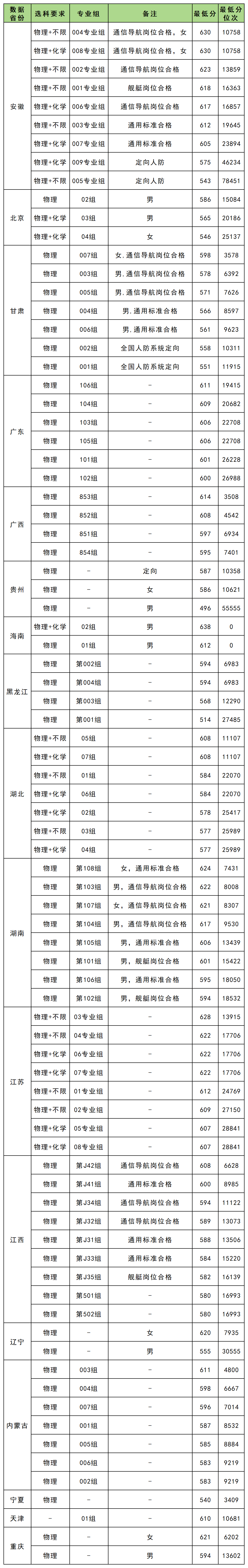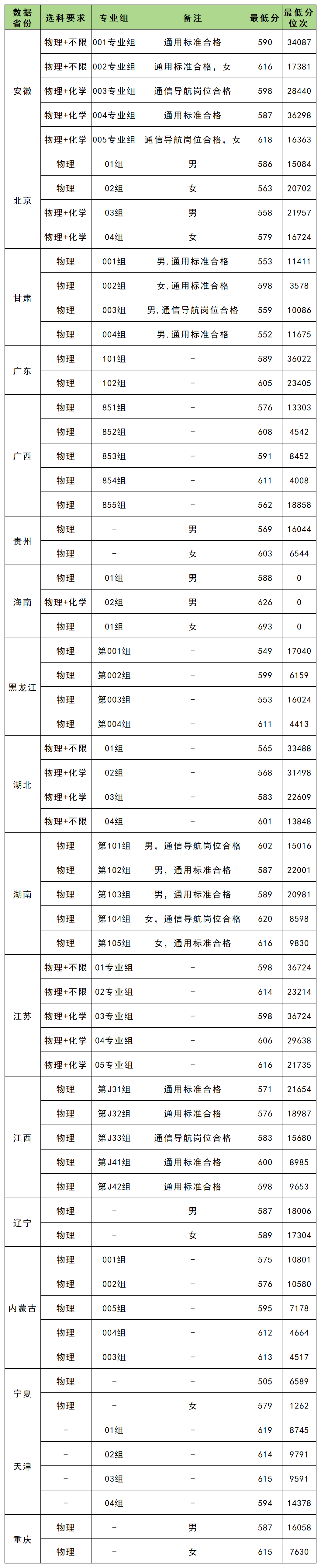 录取分数线在543分-789分之间,录取分数最低的是辽宁物理类543分,招生对象为男生;录取分数最高的是海南01组和03组,最低分均为789分,招生对象为女生。
