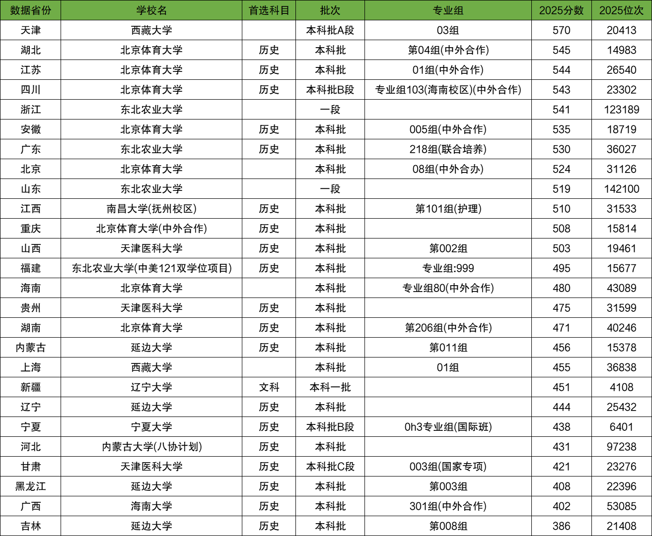 而文科/历史类分数要求最高的地区是天津,2025年天津考生至少要570分才能上211大学,可上的大学为西藏大学(03组)。