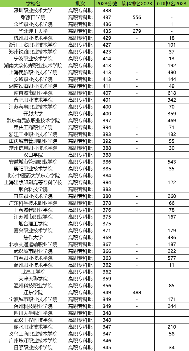 全国在综合类文科招生的255所专科批学校中(含本科带专科的大学),最难考的是深圳职业技术大学,2023最低分438分,张家口学院(437分)同样也是分数很高、实力很好的学校。