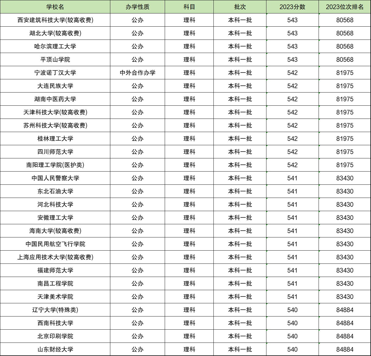 在8万-8.5万位的范围内,最高位次对应的大学是哈尔滨理工大学、平顶山学院等4所,最低录取位次为80568位,位次对应分数为543分;