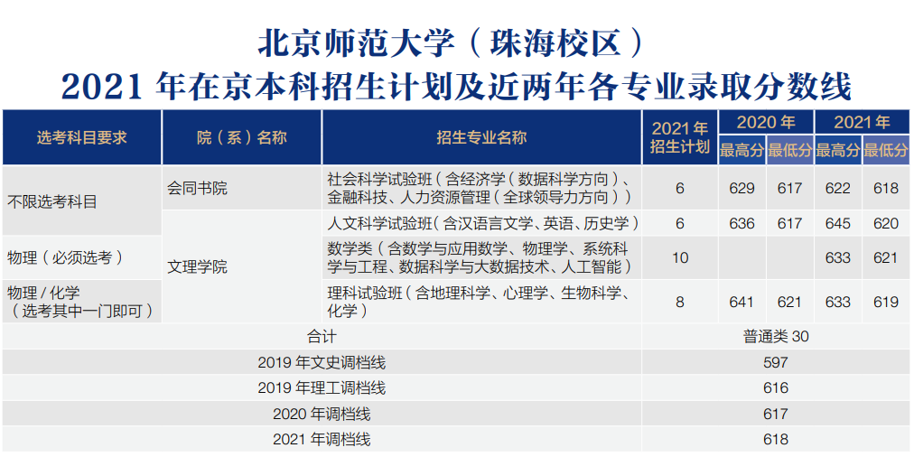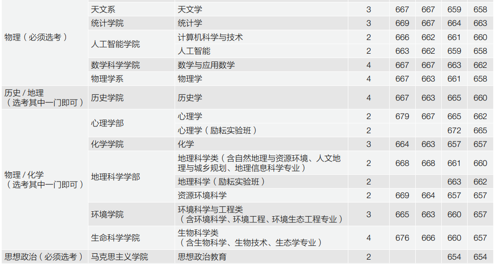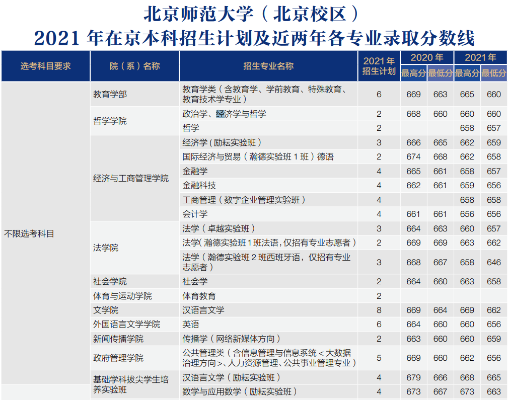 下图是北师大各专业2020-2021年在北京市的最低录取分数线。从这些数据我们可以看到,北师大北京校区大多数的专业分数线基本都在660分以上,是非常高的。珠海校区虽然没有北京校区的分数线高,但也都在610分以上,也是很高的分数。