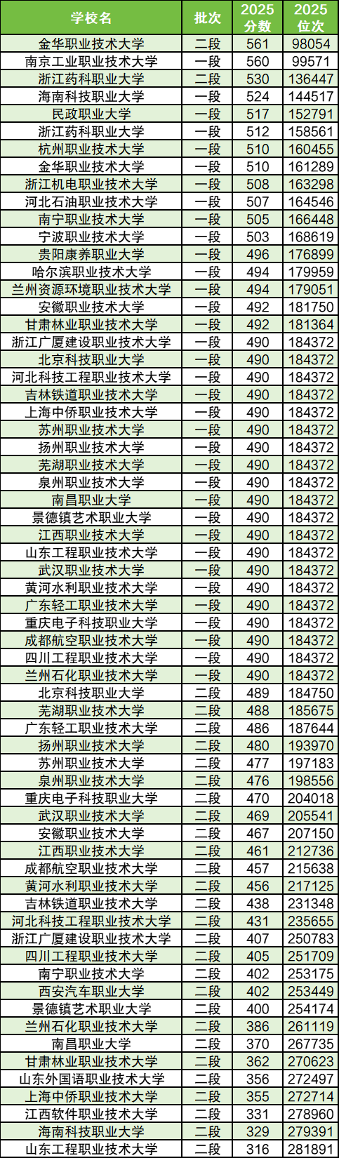 因为不同院校在不同省市区的收分不一样,因此为方便对比,这里我们以浙江省2025年的招录数据为准,为大家列举职业本科大学2025年在浙最低招生分数情况。