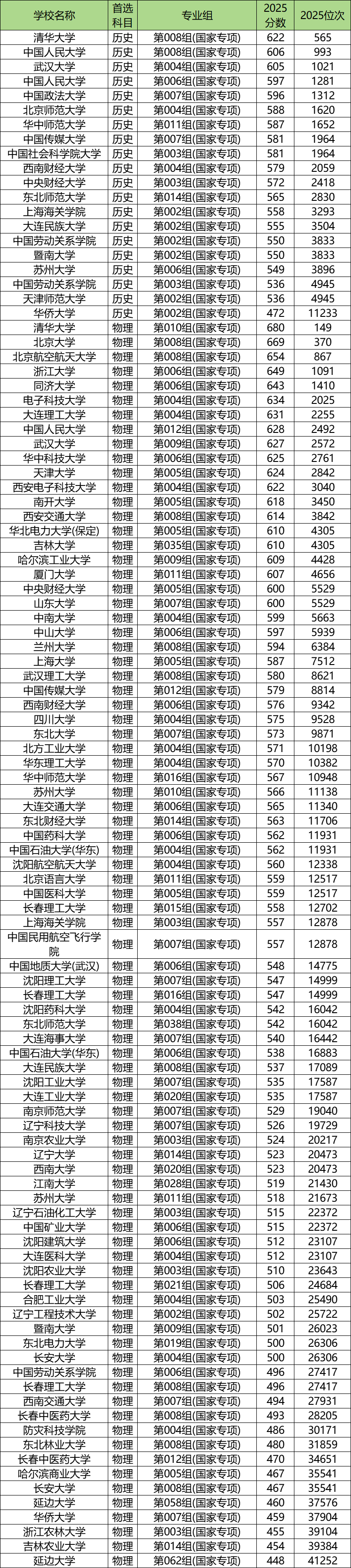 2025年吉林国家专项计划最低录取分数线位于448分到680分之间,收分最低的为延边大学(第062组),最低位次41252名;收分最高的是清华大学(第010组),最低位次149名。