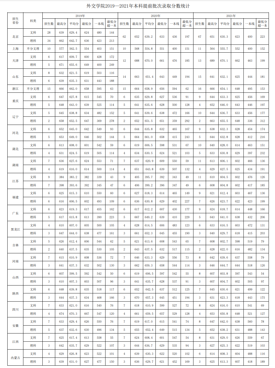 下图是外交学院官网公布的2019年到2021年在全国本科提前批次录取分数线情况,从学校近三年在全国的招生数量来看,学校招生人数并不多。从分数线情况来看,学校在各省市的录取最低分基本在600分以上,且大部分都超出了一本线100分以上。高考是千军万马过独木桥,能够考到600分以上的同学都是非常厉害的。再加上外交学院在部分省市的录取分可以与部分985大学相媲美,更能说明考生实力很强。