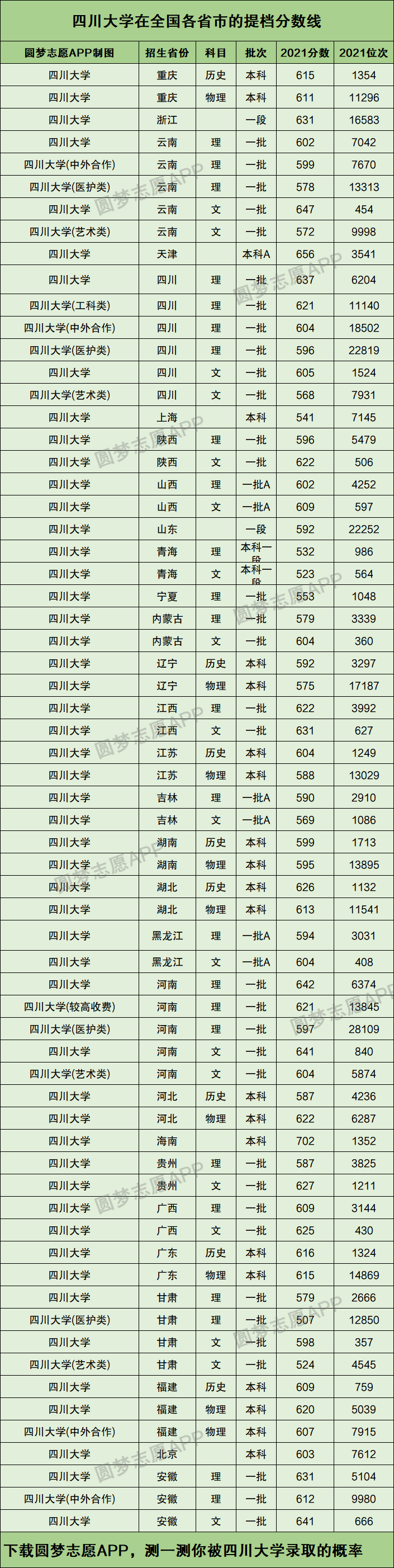 一、四川大学提档线2021年 四川大学位于四川省成都市,所以小编先为大家单独列出了四川大学在四川省2021年的提档分数线。 1、文科 四川大学在本科一批的最低提档线为605分,最低位次为1524名。 四川大学(艺术类) 在本科一批的最低投档分数线为568分,最低位次为7931名。 2、理科 四川大学招理科生时,在本科一批的提档线为637分,最低位次为全省第6204名。 四川大学(工科类) 在本科一批的提档线为621分,最低位次为全省第11140名。 四川大学(中外合作)在本科一批 604分,最低位次为全省第18502名。 四川大学(医护类) 在本科一批596分,最低位次为全省第22819名。 如果你想查看:四川大学各专业——近三年的录取分数线和位次。请直接在手机应用市场下载圆梦志愿APP,获取资料。 二、四川大学调档比例 本文将以四川大学2021年本科招生章程为依据,为大家提供四川大学的调档比例。 四川大学根据各省(直辖市、自治区)生源情况确定提档比例,按照顺序志愿投档的批次,调档比例原则上控制在各省公布计划的120%以内;按照平行志愿投档的批次,调档比例原则上控制在各省公布计划的105%以内。 三、四川大学在全国各省市的提档线汇总 下图为具体的招录数据,同学们在参考时一定不能只看四川大学的最低分,要重点对比四川大学的最低录取位次↓