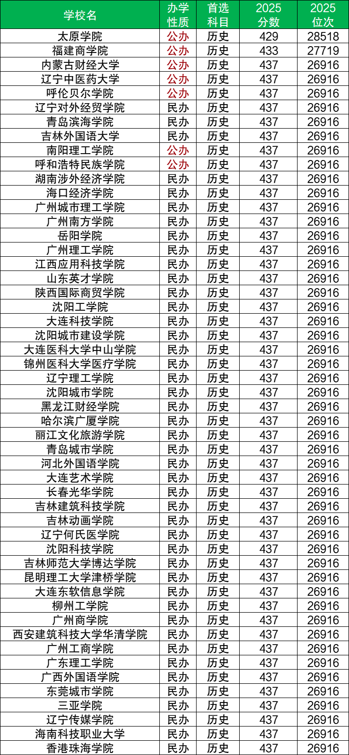 分数在本科线及以下的公办本科包含:太原学院(429分)、内蒙古财经大学、辽宁中医药大学、呼伦贝尔学院、南阳理工学院等,2026届历史类本科压线生或位次在28518名及以内的考生可以考虑报考上述低分院校(注意招生要求)。