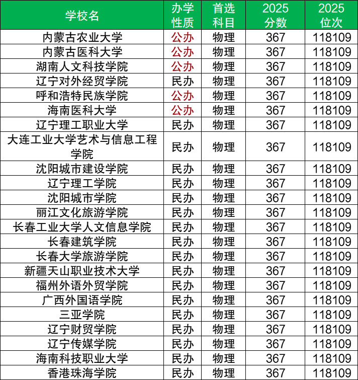 2025年辽宁物理类上本科最低分为367分,共有23个院校志愿处在这个分数上,含民办本科和公办本科。