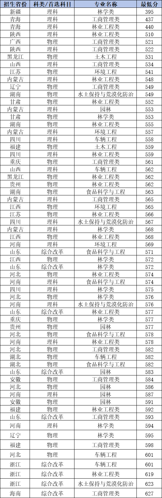 以2024年高考招录数据为例,北京林业大学高校专项计划在全国各省招生分数范围位于395分~627分之间。其中河南考生理科最低需569分(环境工程);内蒙古考生理科最低需548分(林业工程类)等。