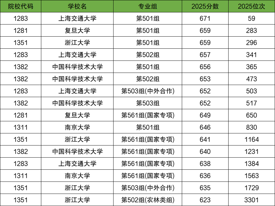 物理类分数线最高的是上海交通大学第501组(代号1283),2025年最低分671,对应最低位次59名。其次是复旦大学第501组(代号1281),2025年最低分659,对应最低位次283名。