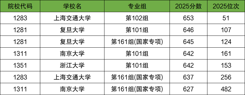 分数线较低的华东五校还有上海交通大学第161组(国家专项)(637分)、浙江大学第101组(642分)、南京大学第101组(642分)等。