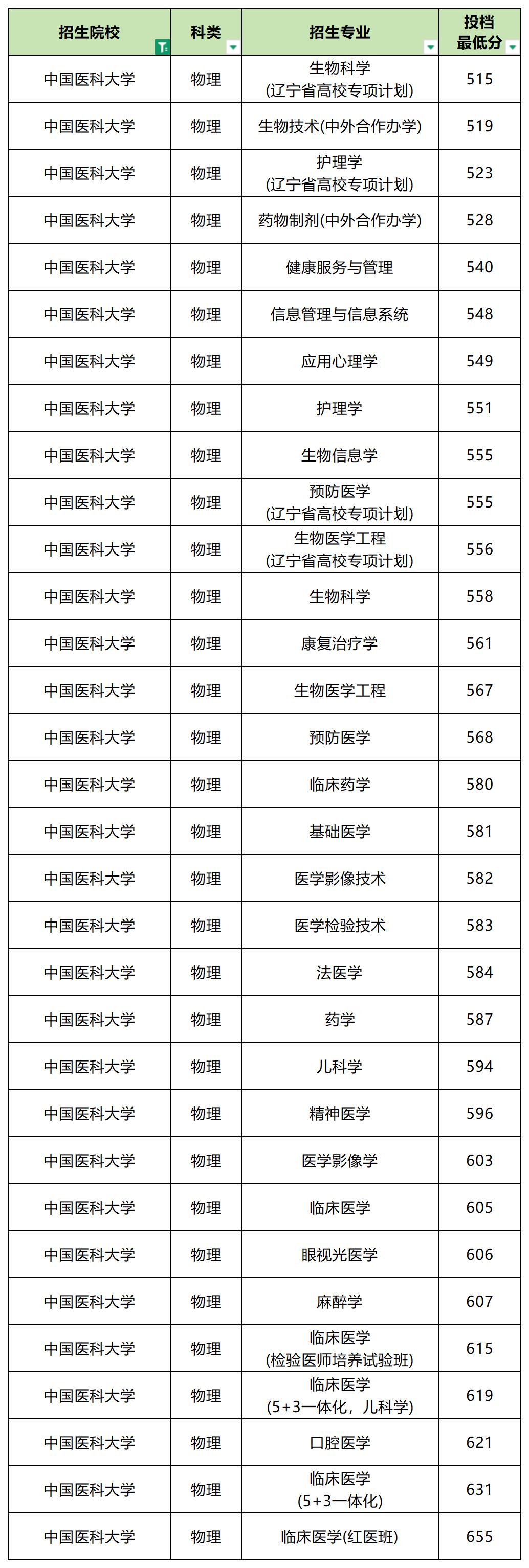 物理类分数范围:515分~655分;最低分专业是生物科学(辽宁省高校专项计划)、最高分是临床医学(红医班)。