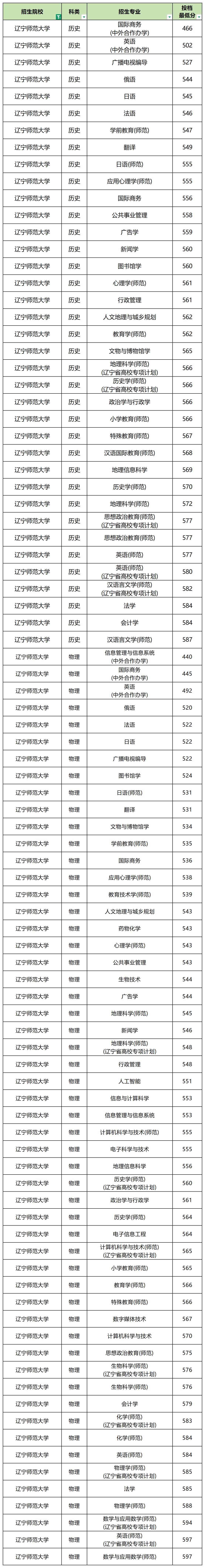 物理类分数范围:440分~597分;最低分专业是信息管理与信息系统(中外合作办学)、最高分专业是数学与应用数学(师范)和英语(师范)(辽宁省高校专项计划)。