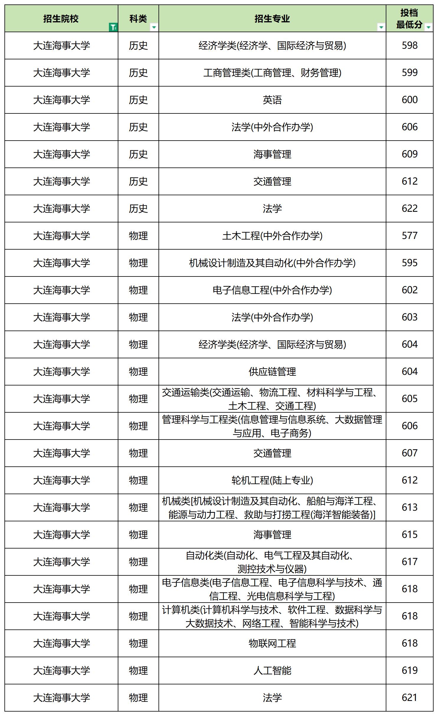 历史类分数范围:598分~622分;最低分专业是经济学类、最高分专业是法学;