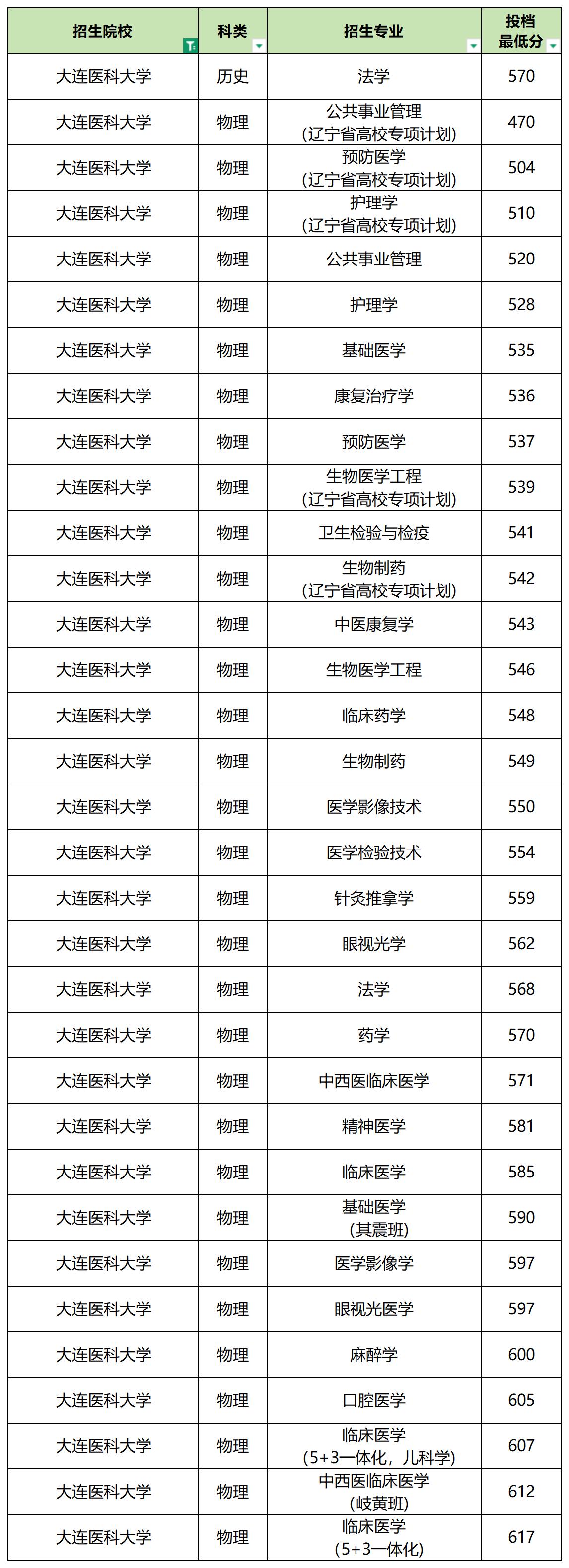 物理类分数范围:470分~617分;最低分专业是公共事业管理(辽宁省高校专项计划)、最高分专业是临床医学(5+3一体化)。