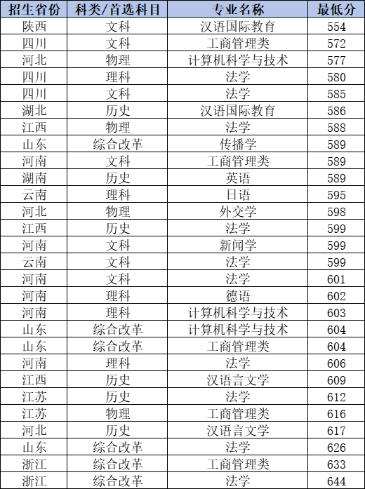 以2024年高考招录数据为例,北京外国语大学高校专项计划在全国各省招生分数范围位于554分~644分之间。其中河北考生物理类最低需577分(计算机科学与技术),历史类最低需617分(汉语言文学);江苏考生物理类最低需616分(工商管理类),历史类最低需612分(法学)等。