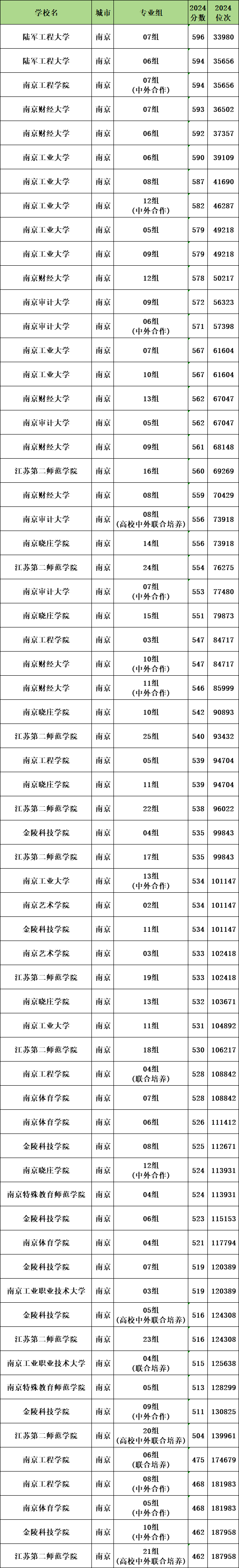 2024年南京物理类公办二本大学录取分数线从462分到596分之间,对应最低排位从33980名到187958名。