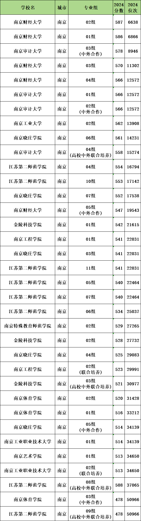 2024年南京历史类公办二本大学录取分数线从478分到587分之间,对应最低排位从6638名到50966名。