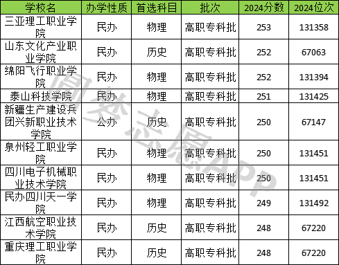 物理类250分左右(248分-253分之间)能上的大学有6所,有三亚理工职业学院(253分)、绵阳飞行职业学院(252分)、泰山科技学院(251分)等。