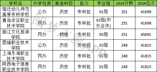 在江苏省250分左右(248分-253分之间)的可以上大学,专科历史类有5所;其中公办院校2所,有宿迁幼儿师范高等专科学校(251分)、恩施职业技术学院(248分)。民办院校3所,有青岛求实职业技术学院(251分)、上海东海职业技术学院(248分)、陕西电子信息职业技术学院(248分)。