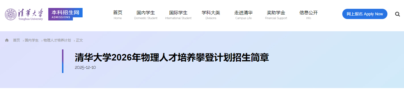 招生简章:清华大学2026年物理人才培养“攀登计划”招生简章