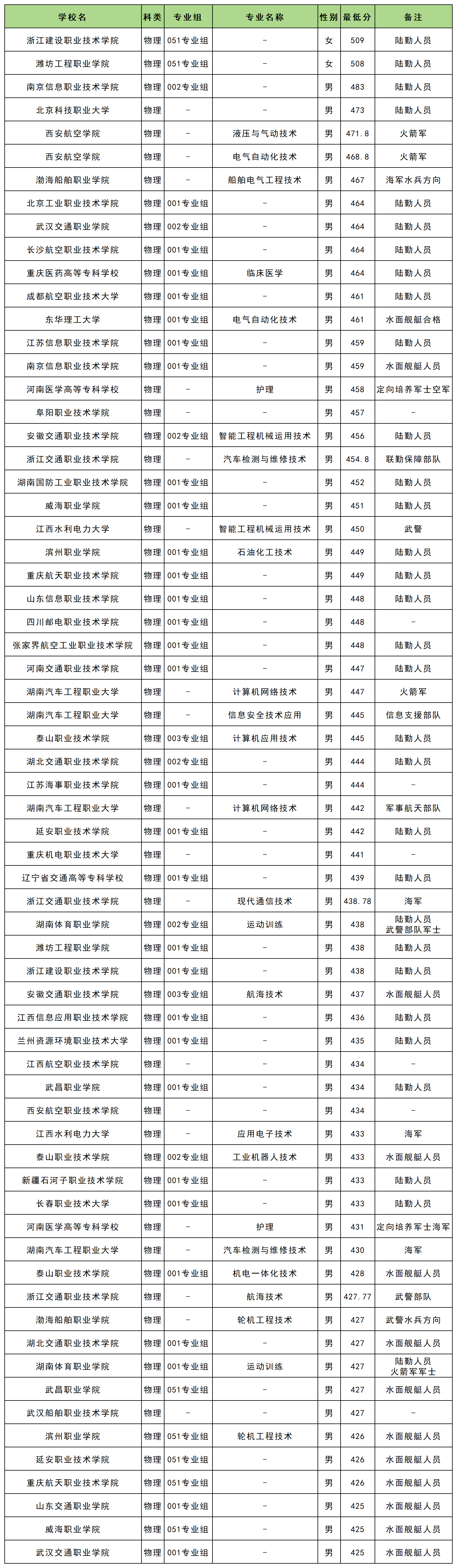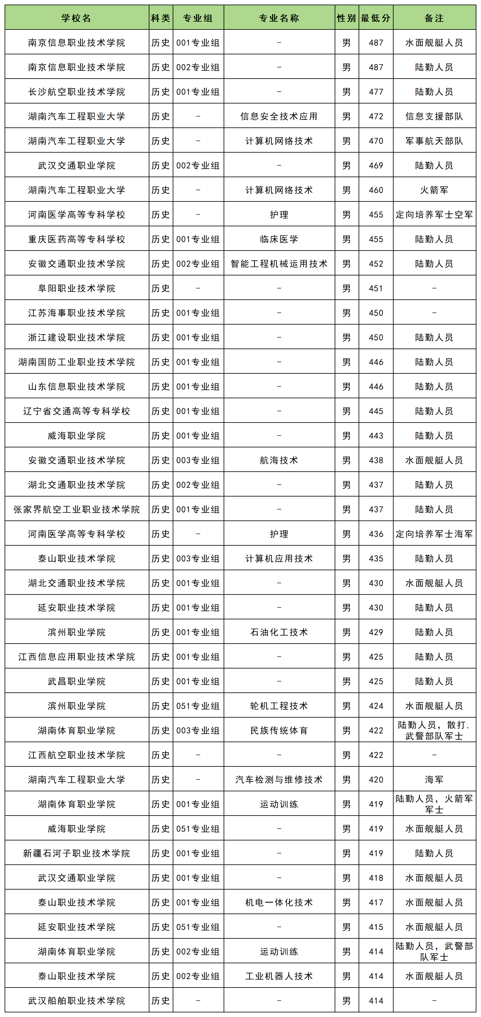 对于历史类考生来说,最低仅需414分就可以报考定向士官学校,分数线最低的是武汉船舶职业技术学院(男生)。