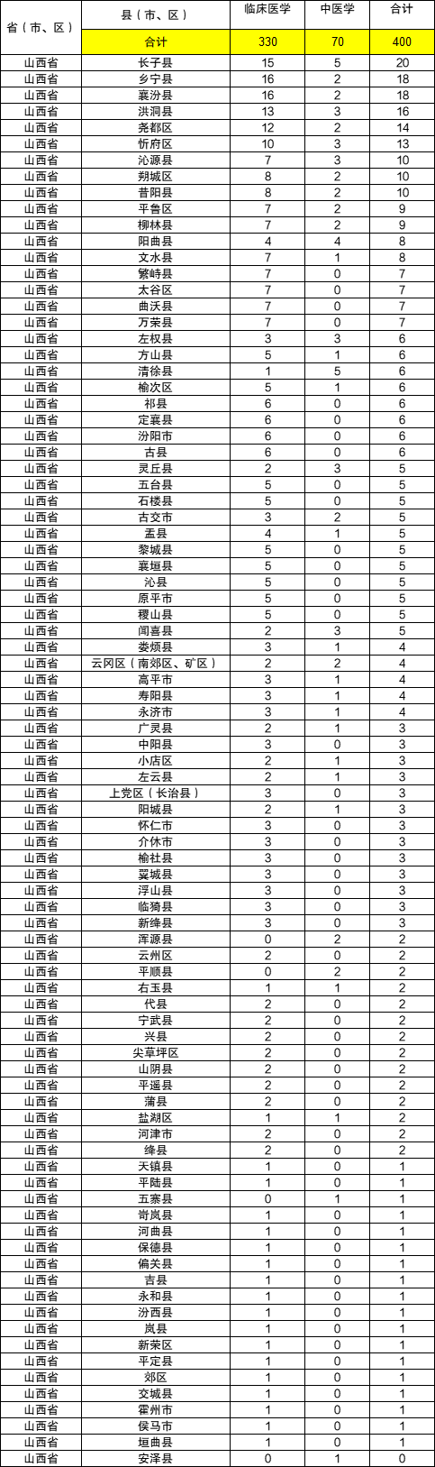 2024年山西定向医学生共招生400人,其中临床医学专业330人、中医学专业70人。招生人数最多的十个地区如下: