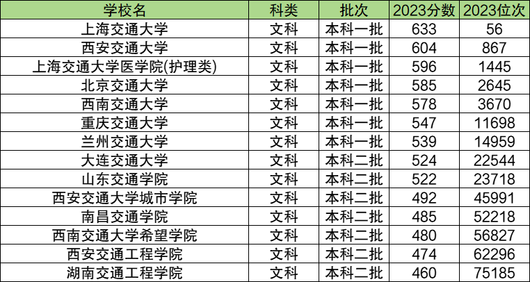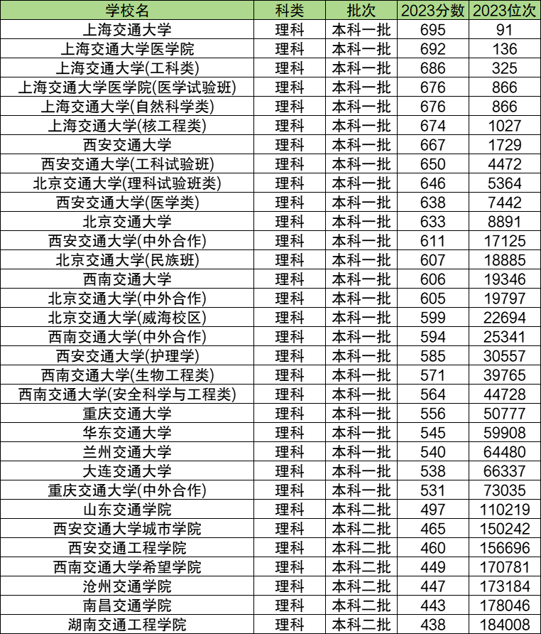 下表为全国在文理科招生的全部交通大学。