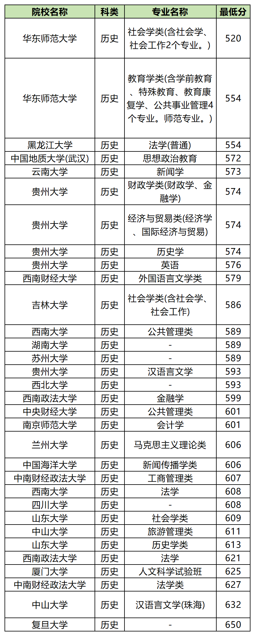 2、历史类:最低分520分