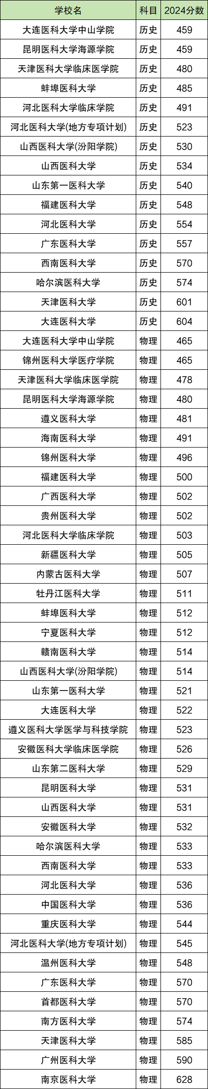 2024全国医科大学在历史类录取分数线459分-604分。最高录取分数线对应院校:大连医科大学;最低录取分数线对应院校:大连医科大学中山学院。