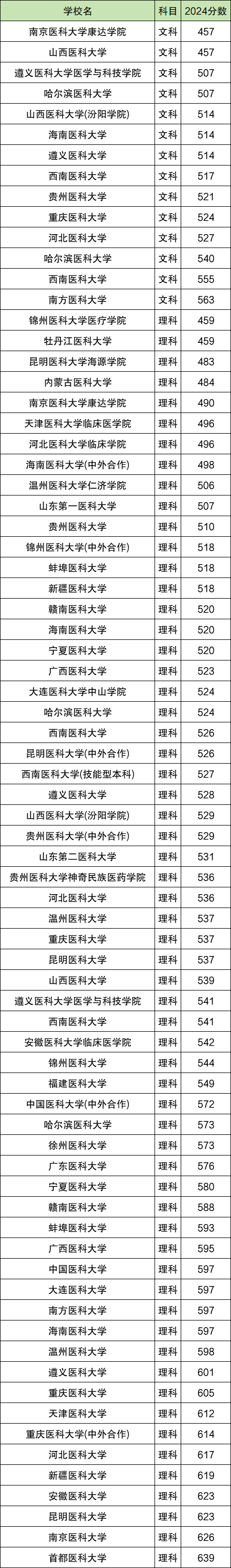 2024全国医科大学在文科录取分数线457分-563分。最高录取分数线对应院校:南方医科大学;最低录取分数线对应院校:南京医科大学康达学院。