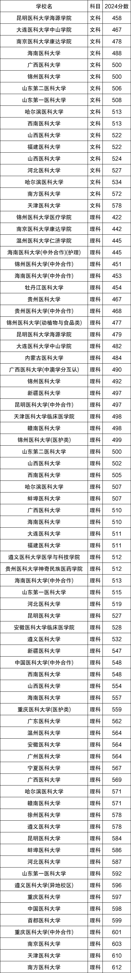 2024全国医科大学在理科录取分数线422分-612分。最高录取分数线对应院校:南方医科大学;最低录取分数线对应院校:锦州医科大学医疗学院。