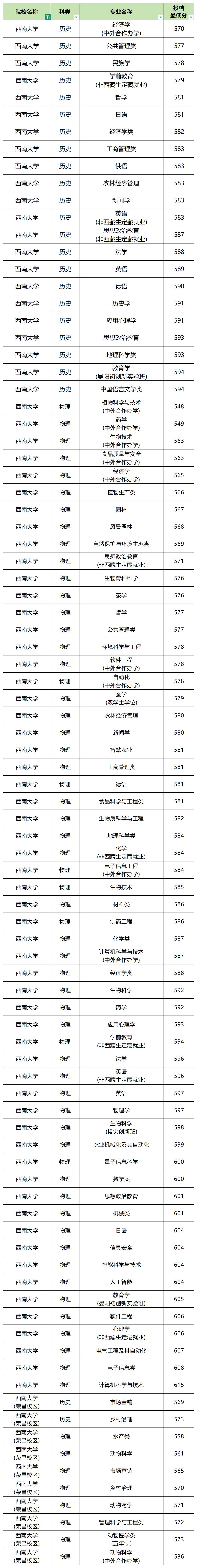 历史类分数范围:569分~594分;最低分专业是市场营销(荣昌校区),最高分专业是中国语言文学类和教育学;